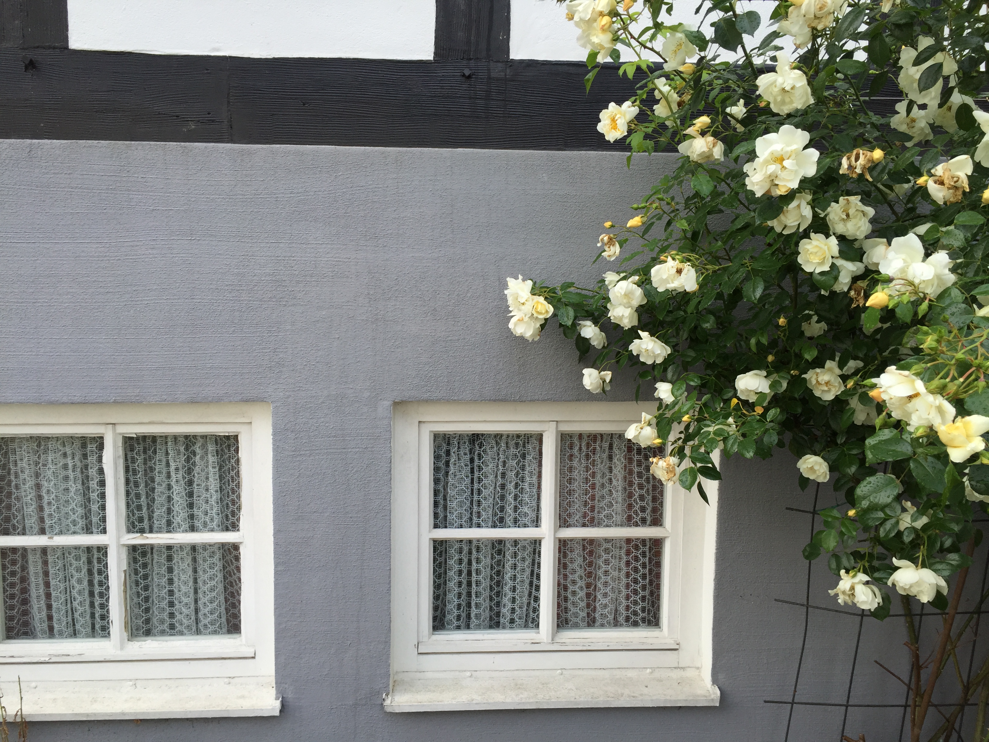 グレーの壁に白いバラ。ドイツのまちかどでは良くみかけます。