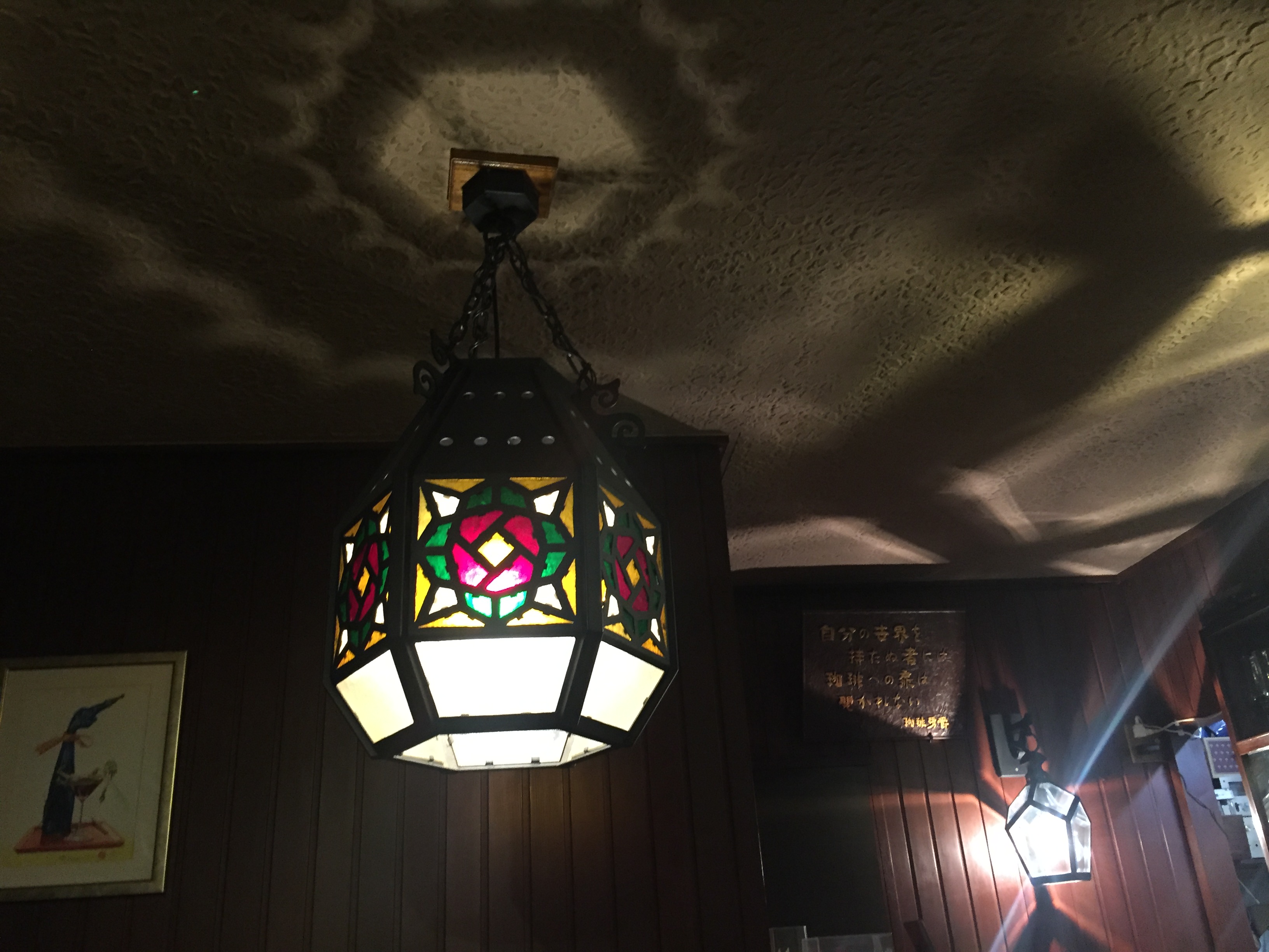 よく行く喫茶店のツバキの柄のランプシェード。可愛らしくてわたしのお気に入りです。