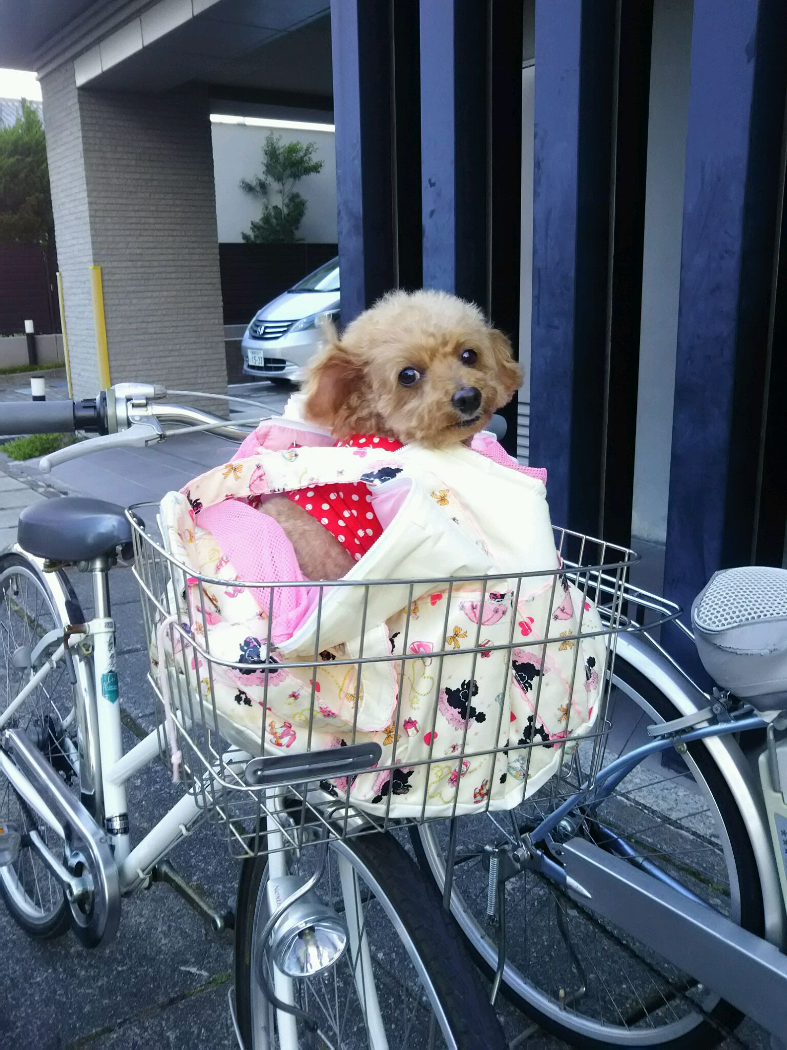 ぼくの愛車はお父さんの運転する自転車です。風が気持ちいワン!