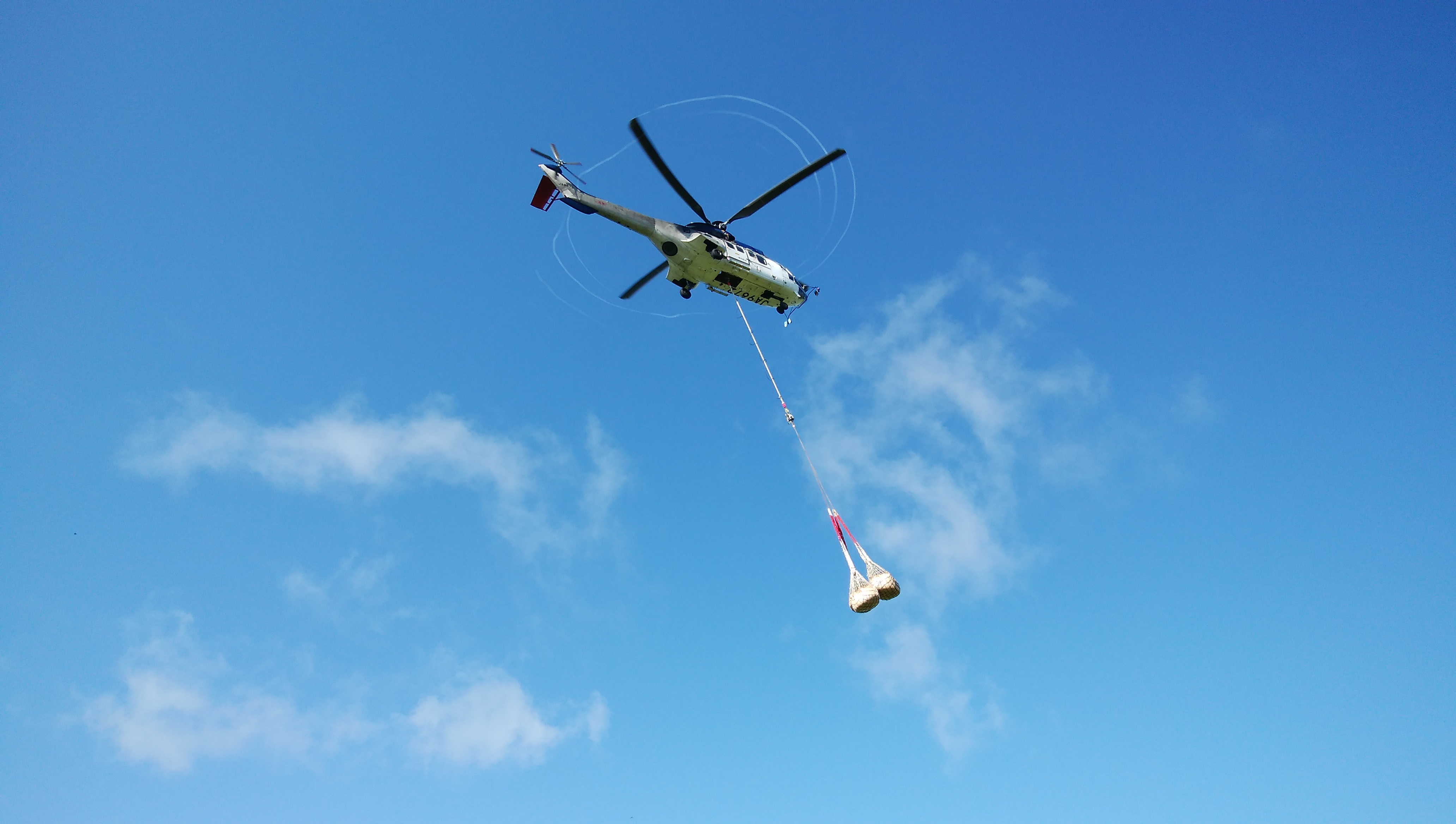 鳥海山の山小屋に資材を運ぶヘリコプターに遭遇。下から数分で運び、何度も往復していました。
